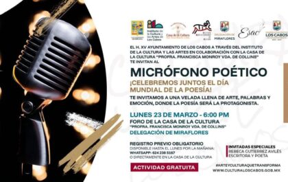 Invita Ayuntamiento de Los Cabos a “Micrófono Poético” en Miraflores por el Día Mundial de la Poesía.