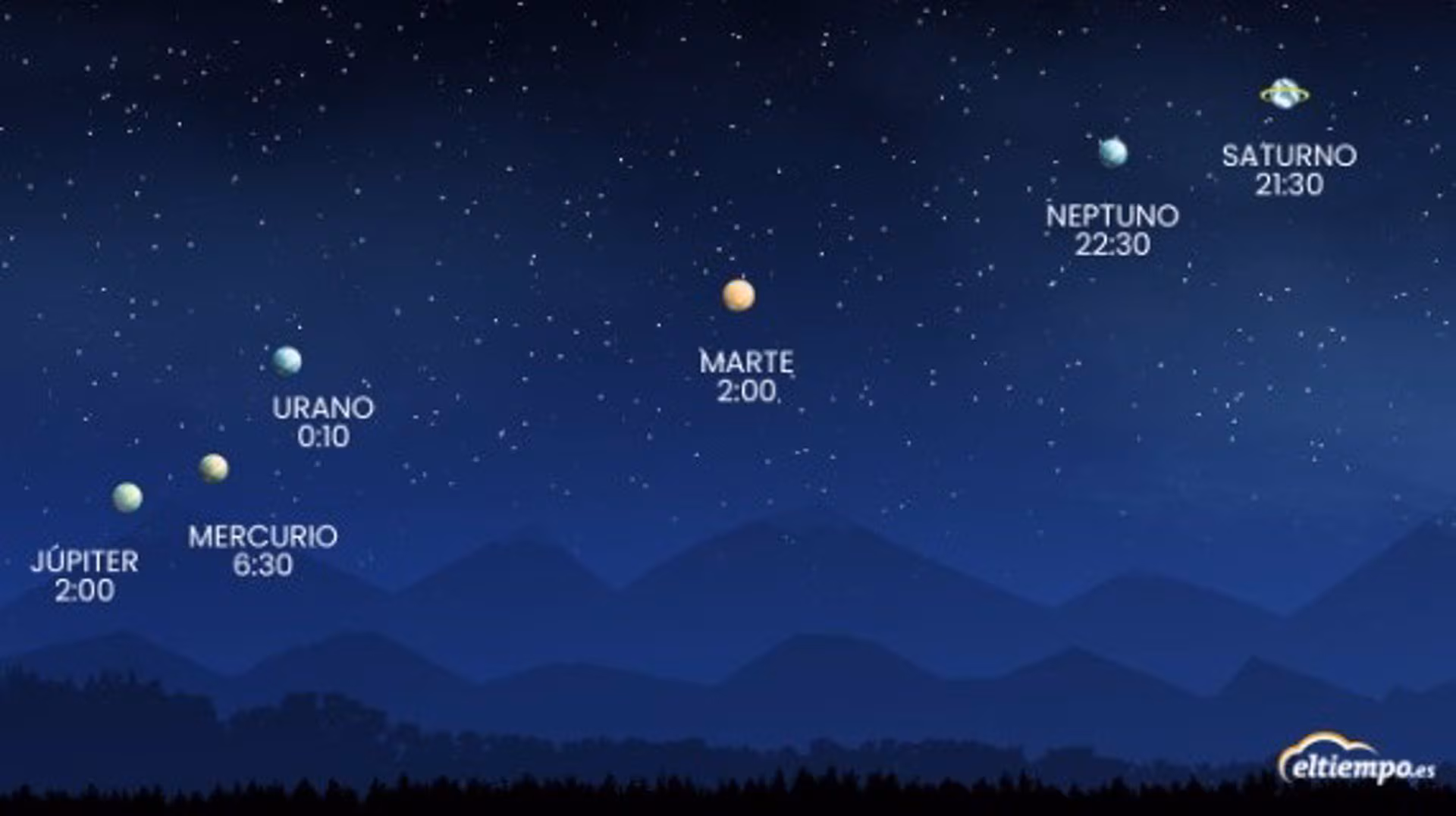 Durante las últimas horas del 28 de febrero, el cielo nocturno servirá de plataforma para una reunión de seis integrantes de nuestro sistema solar:Mercurio, Venus, Júpiter, Saturno, Urano y Neptuno.