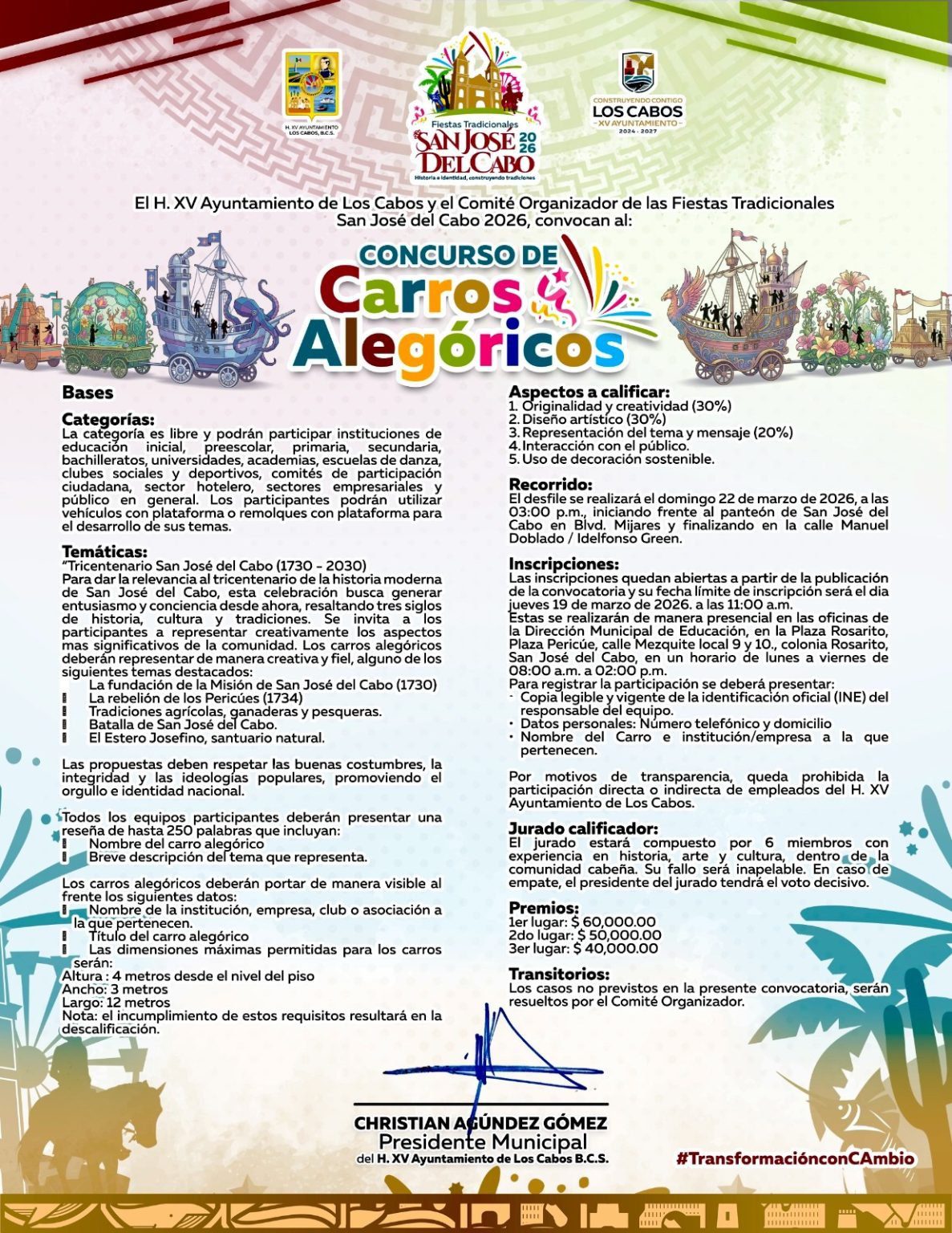 Los Cabos, Baja California Sur.– El XV Ayuntamiento de Los Cabos, en coordinación con el Comité Organizador de las Fiestas Tradicionales San José del Cabo 2026, lanzó la convocatoria para participar en el Concurso de Carros Alegóricos, actividad que formará parte del tradicional desfile programado dentro de estas celebraciones.