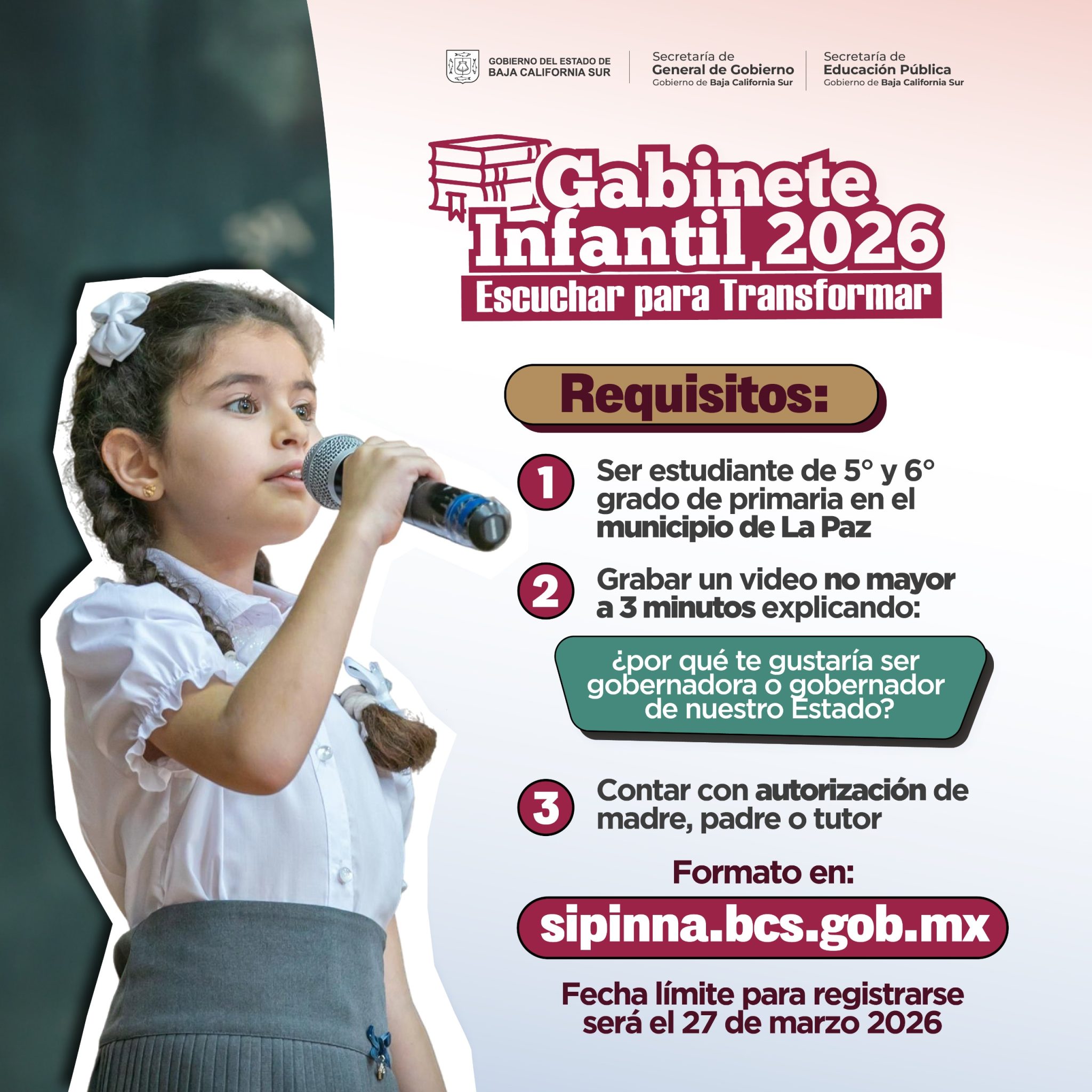 La Secretaría General de Gobierno, a través del Sistema Estatal de Protección Integral de Niñas, Niños y Adolescentes (SIPINNA), informa que se amplió hasta el viernes 27 de marzo la convocatoria para participar en el Gabinete Infantil 2026 “Escuchar para transformar”.