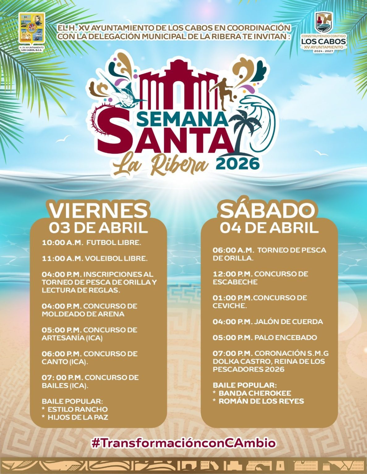 El XV Ayuntamiento de Los Cabos, en coordinación con la Delegación Municipal de La Ribera, invita a la ciudadanía a participar en las actividades programadas con motivo de Semana Santa La Ribera 2026, a realizarse los días 3 y 4 de abril.