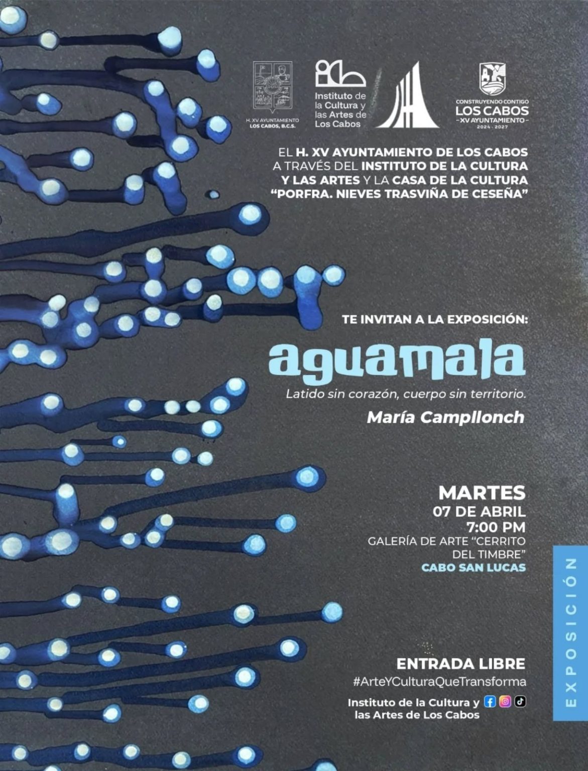 Los Cabos, Baja California Sur.– Con el propósito de seguir fortaleciendo la promoción artística y cultural en el municipio el Instituto de la Cultura y las Artes de Los Cabos, invita a la ciudadanía a la inauguración de la exposición de arte “Agua Mala, latido sin corazón, cuerpo sin territorio”, de la artista María Campllonch.