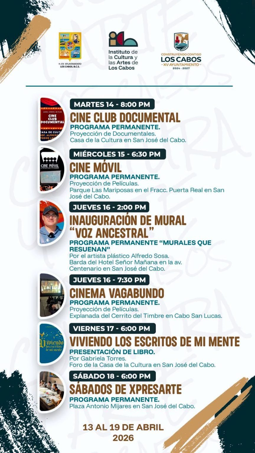 A partir de este martes 14 de abril, San José del Cabo y Cabo San Lucas serán sede de actividades que incluyen cine, artes plásticas y literatura, con el objetivo de descentralizar la oferta cultural y fomentar la participación comunitaria.