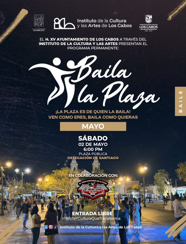Los Cabos, Baja California Sur.– El XV Ayuntamiento de Los Cabos, a través del Instituto de la Cultura y las Artes (ICA), invita a la ciudadanía a participar en una nueva edición del programa “Baila la Plaza”, que se realizará el próximo sábado 2 de mayo en la delegación de Santiago.